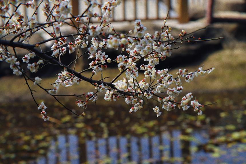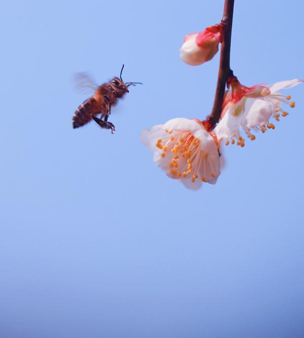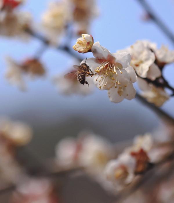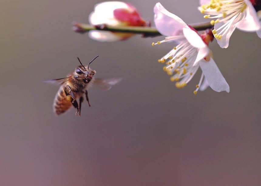 竞相绽放的梅花吸引许多蜜蜂前来采蜜。郭英摄