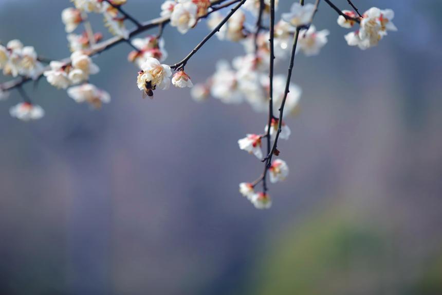 竞相绽放的梅花吸引许多蜜蜂前来采蜜。郭英摄人民网湖口2月20日电 连日来,江西省九江市湖口县台山公园内梅花竞相绽放,春光无限。透过镜头,粉白相间的梅花在露珠的点缀下显得更加娇艳欲滴,蜜蜂在繁花间飞舞授粉,它们震动着翅膀,扑进花丛中,忙个不停。(罗娜、郭英)